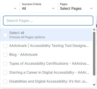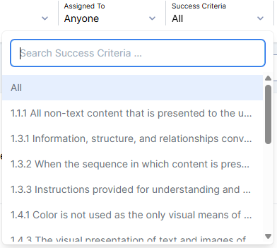 Issues can be sorted by WCAG Success Criteria. Depending on the Success Criteria of issues captured on the site, either through automatic or manual audits, these criteria will be listed out on the dropdown to use as filters.