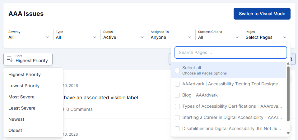 Use the filters in the Issues tab to search, sort, and prioritize accessibility issues. Filters include severity, status, assignment, and more, helping you focus on what matters most.