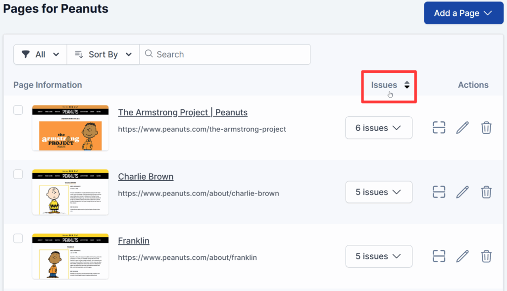 The pages listing table allows you to sort pages by issue count or by using the sort filter options listed below: