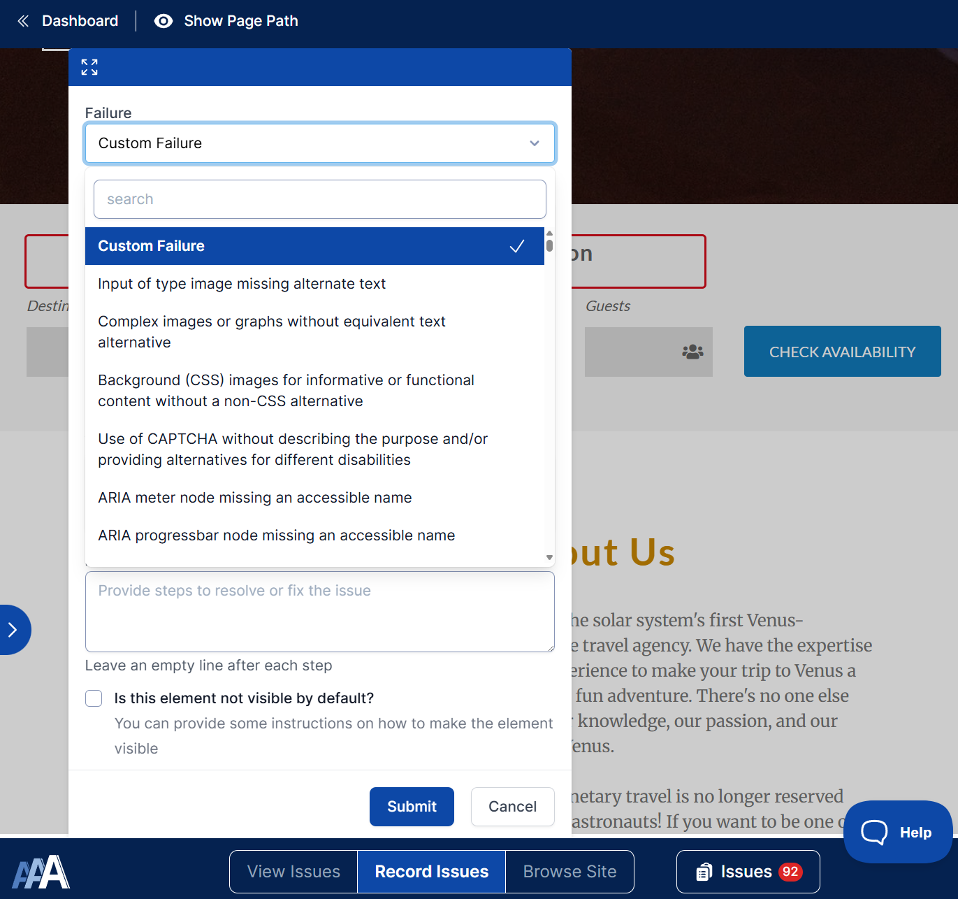 AAArdvark simplifies the process of recording manual issues in Visual Mode. This guide will walk you through how to document Custom Failures while manually auditing your site for accessibility.