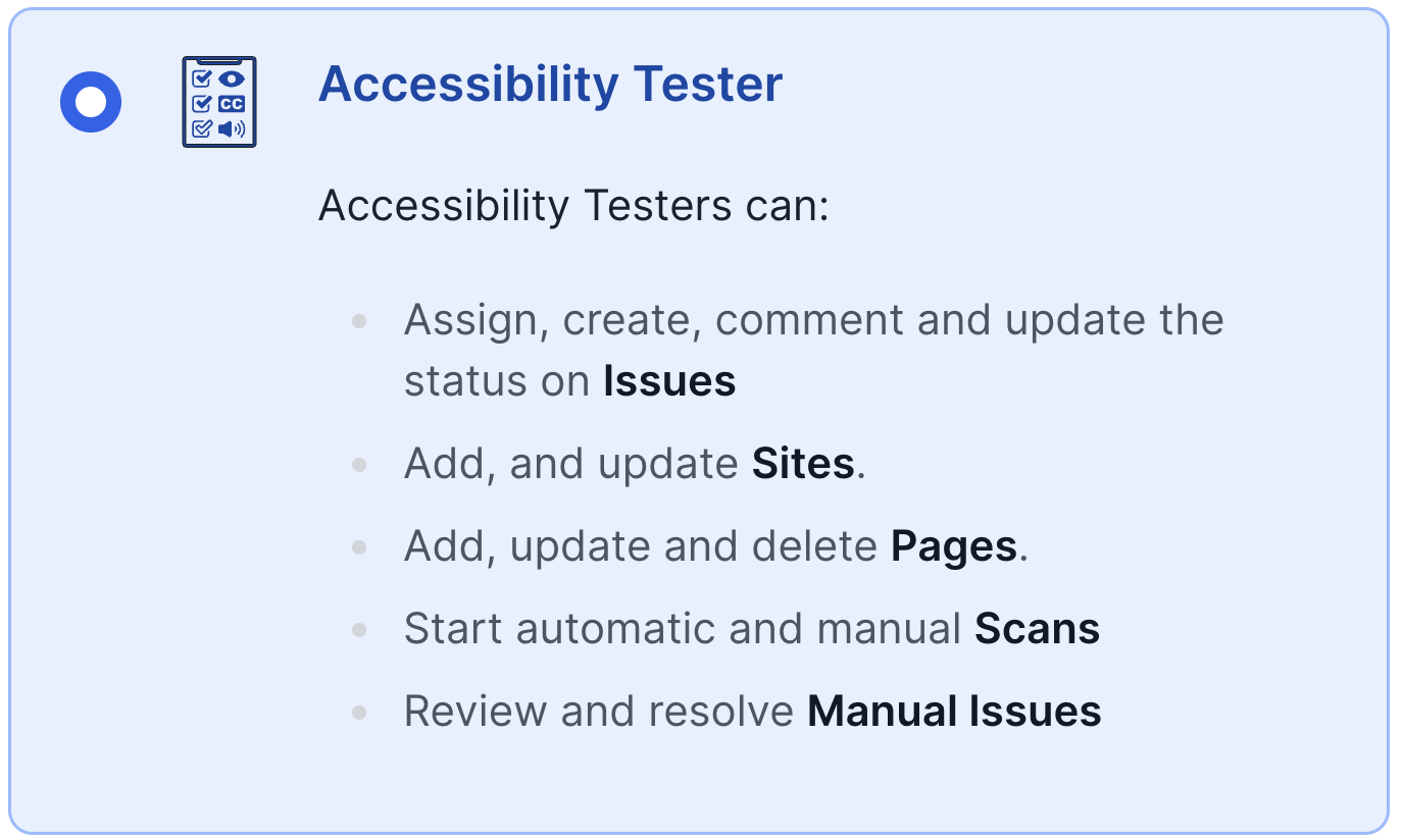 Assigning this role gives users the ability to record issues, update status, assign issues, run scans, and resolve manual issues. Accessibility Testers also get notifications when developers mark an issue as fixed and can confirm the resolution.