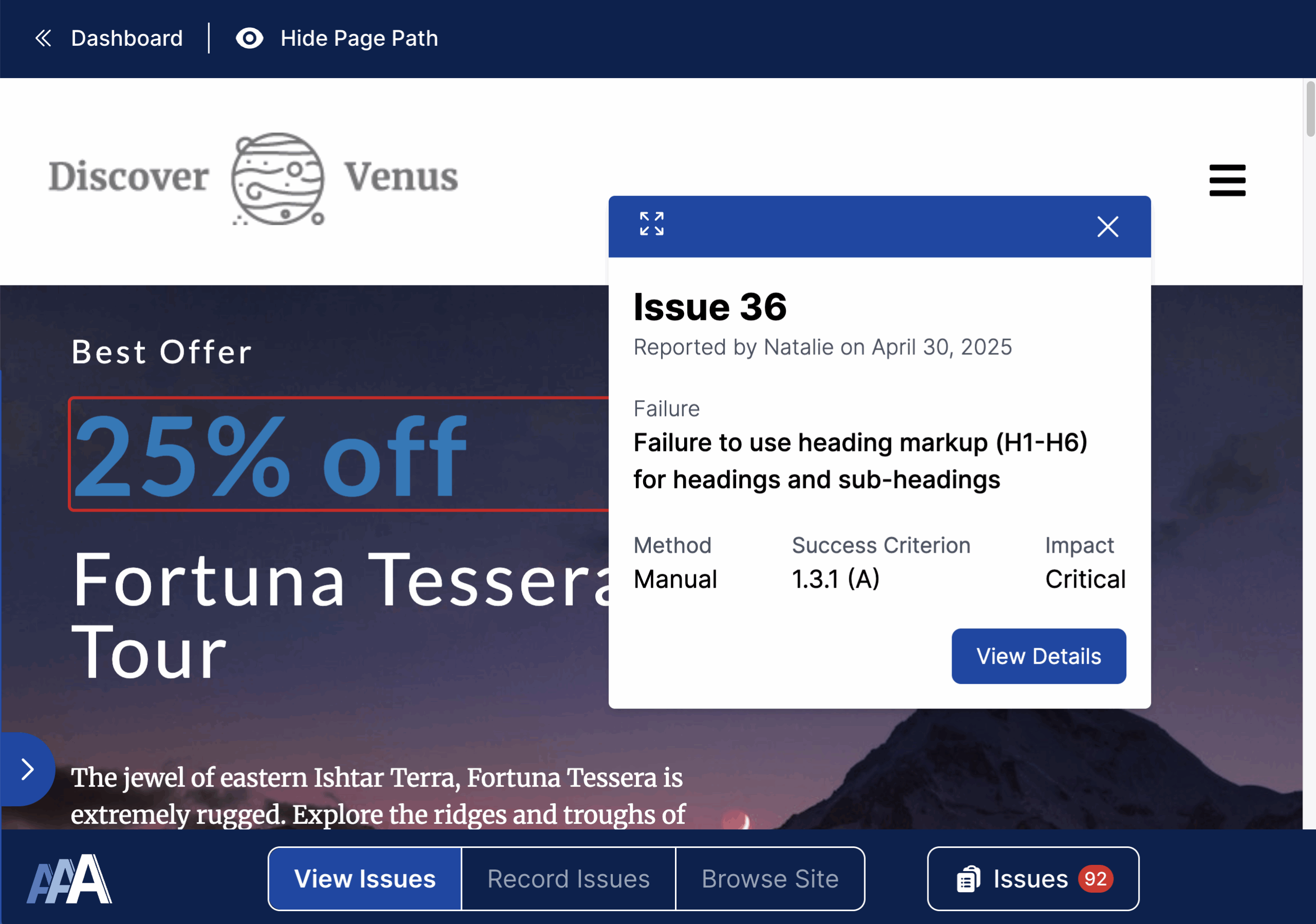 - Select from a pre-set list of failures, already mapped to Severity, WCAG Success Criteria, and possible Solutions.
