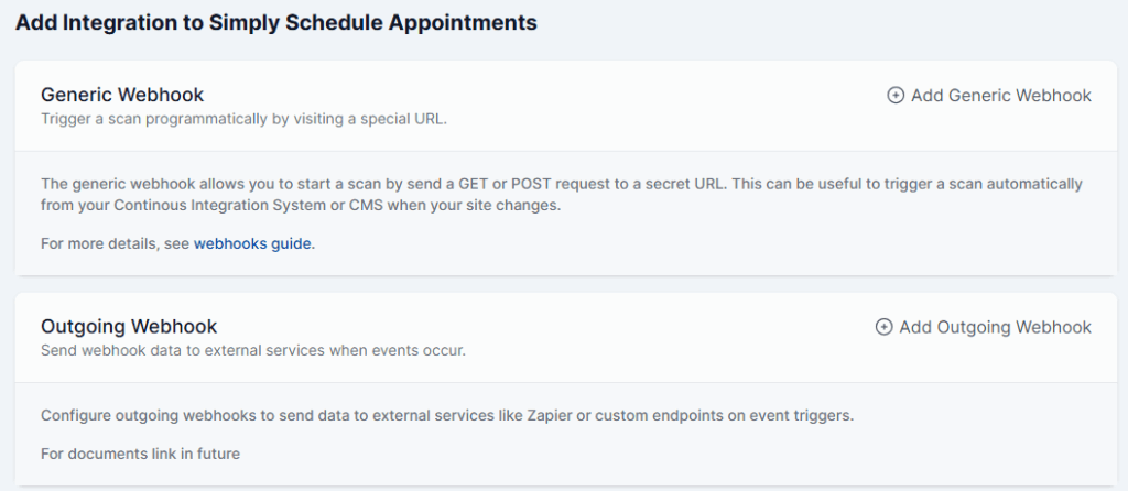 Generic Webhooks let you trigger scans or actions programmatically by sending a GET or POST request to a secret URL. This is useful for automating scans from systems like Continuous Integration (CI) pipelines or CMS platforms when your site changes.