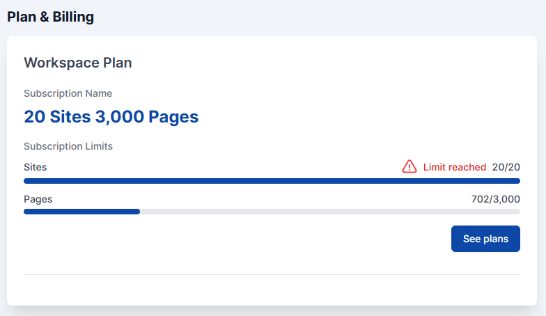 If your plan creeps closer to the limit of sites or pages your plan allows, you’ll be notified.