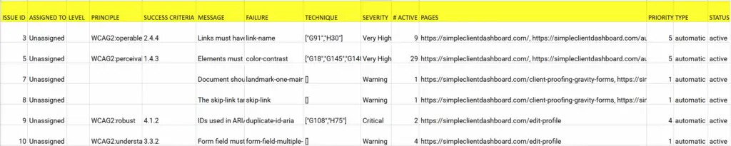 The xlsx report provides detailed, sortable data to help you manage accessibility issues efficiently. It includes: