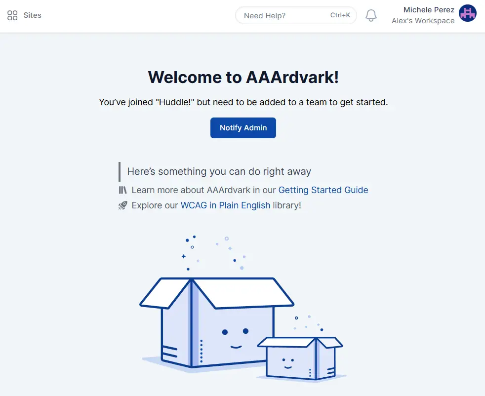 When a user is invited to the Workspace and has not yet been added to a team, they can click Notify Admin to issue a notification informing the admin.