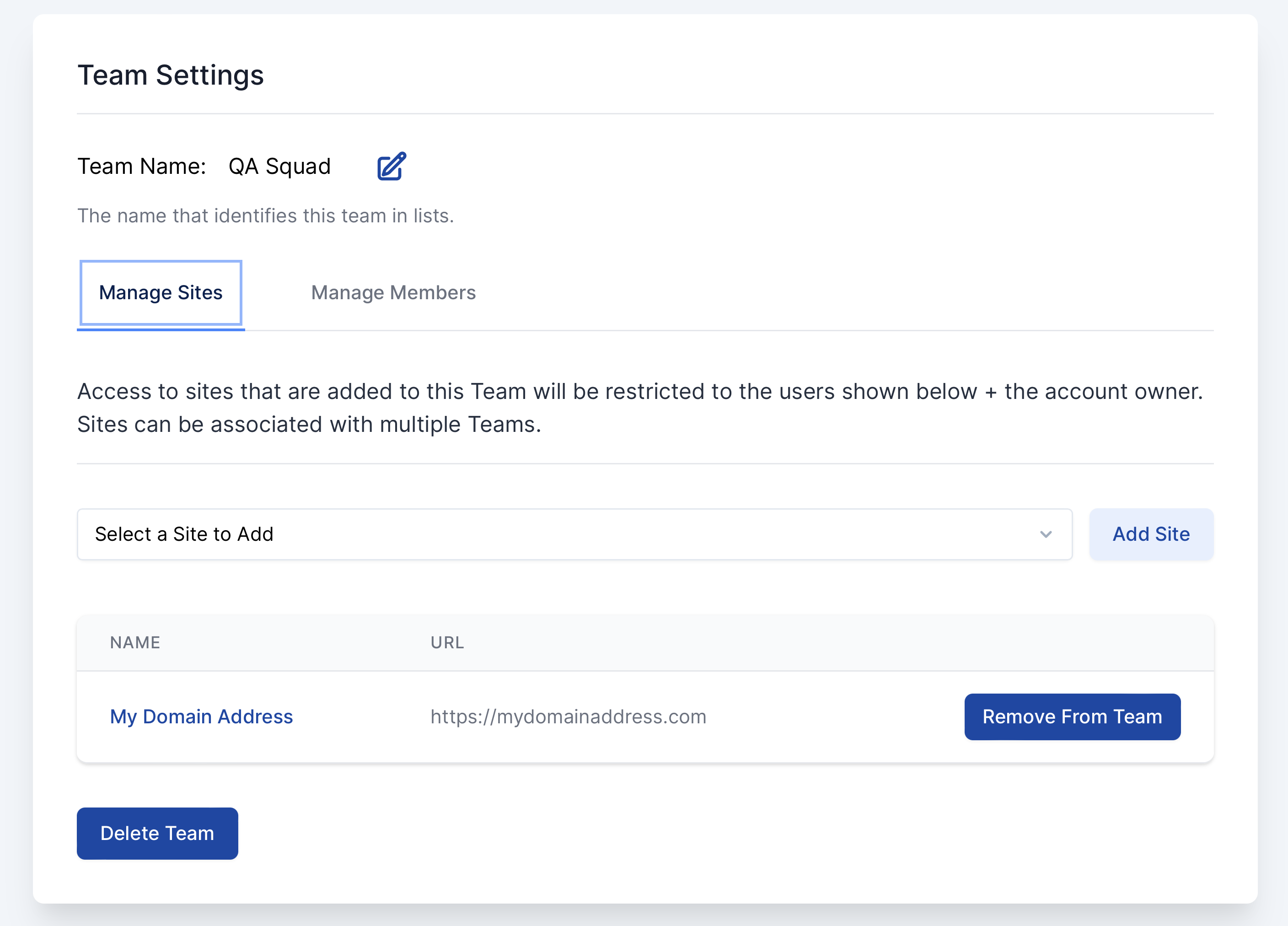 - Manage Sites: Use the dropdown to add sites this Team can access.