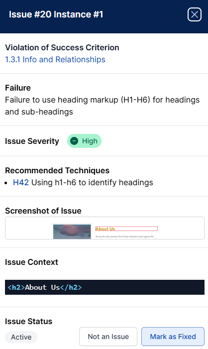 - Violation of Success Criterion: The Success Criteria that the failure violated, leading to the WCAG in Plain English site for more information.